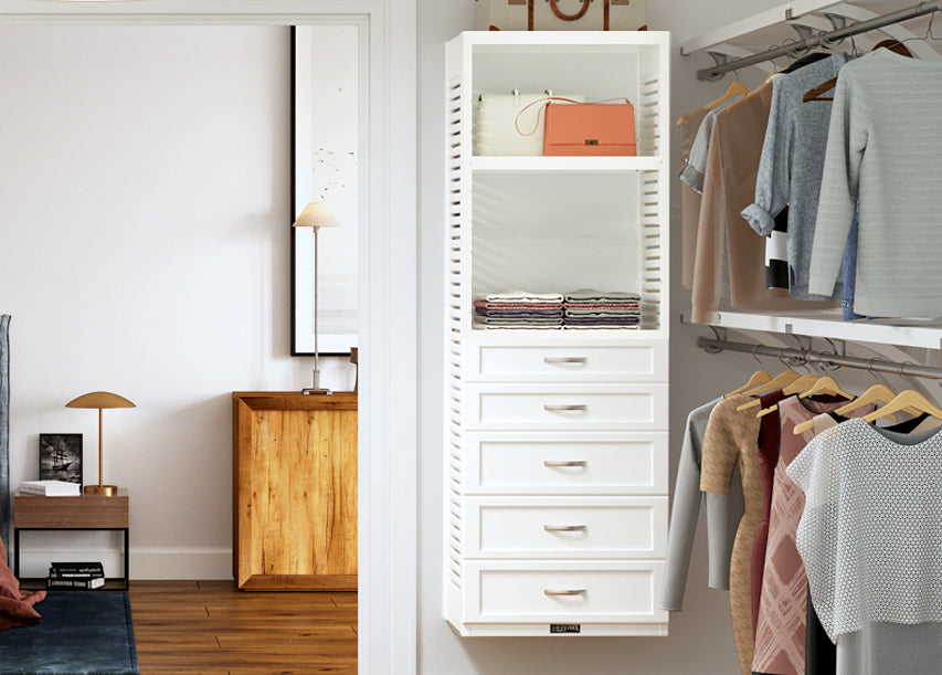 Imagine a perfectly organized home that reflects your unique style and simplifies your daily life. You can achieve this with your John Louis Home Solid Wood Closet Tower with Drawers! This premium DIY closet tower system with drawers is designed to bring you unparalleled storage and organization versatility. This 6ft tower is a great solution for large spaces, featuring five stylish Shaker Style Drawers to organize all your items, and ventilated adjustable shelves providing open access. You'll gain plenty of shelving and hanging space.